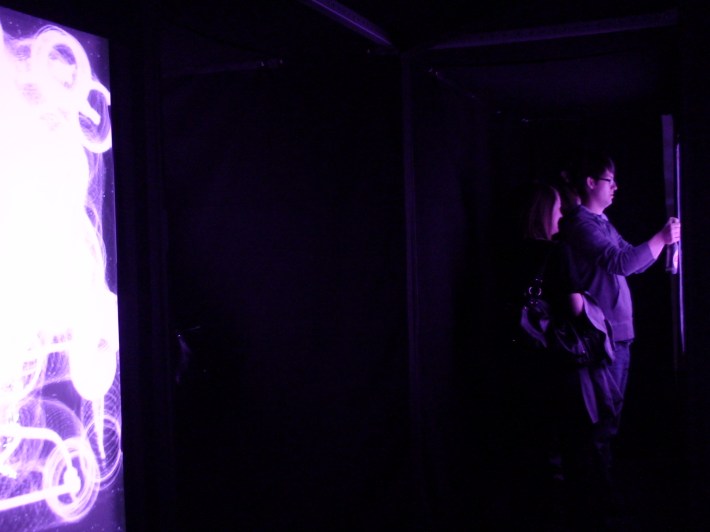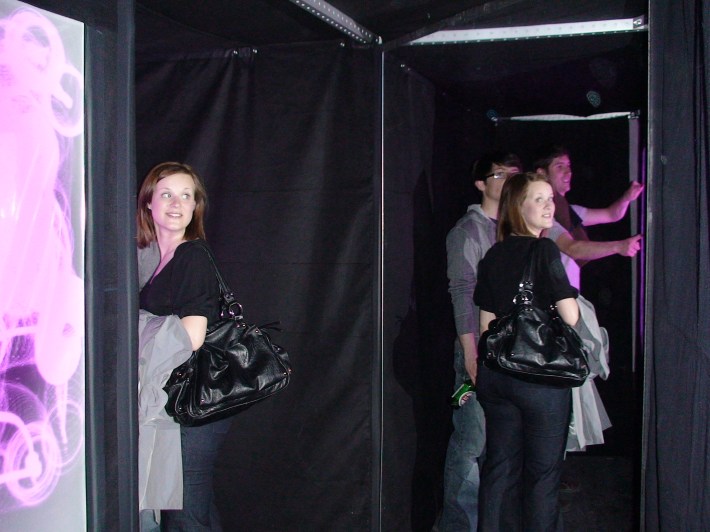 The person we see in the picture is not in front of us physically; it is an illusion (reflection) of the person who is on the other side of the hallway. In see.saw, we see around corners but are not aware that we do so. We see/experience mixed time and space of the visual/auditory environment.
