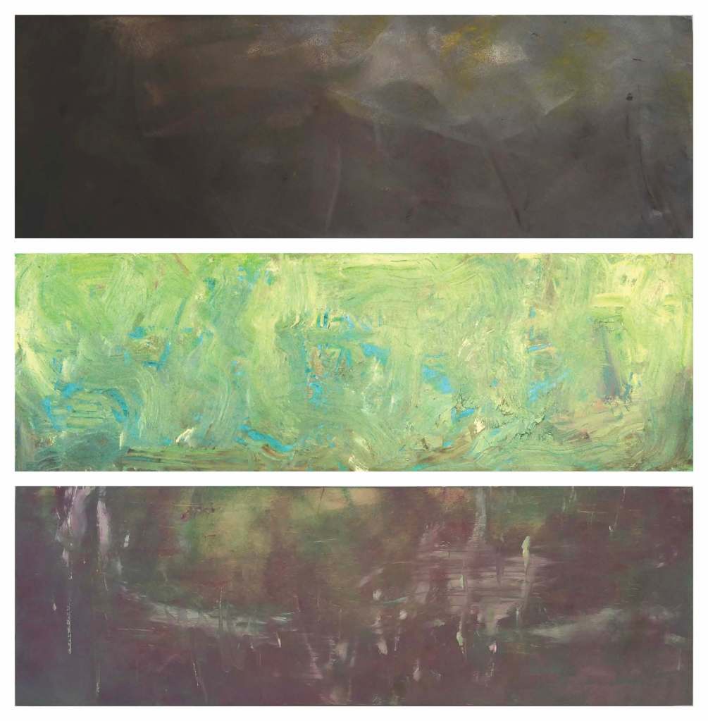 These paintings were autographically painted in response to the novel’s primary dream sequence. The abstract expressionist style functions as initialization “noise” influencing network processing of the image sequences to follow. The three paragraphs of the novel’s dream sequence are iteratively combined with each of the three paintings to create a matrix mapping of latent space.