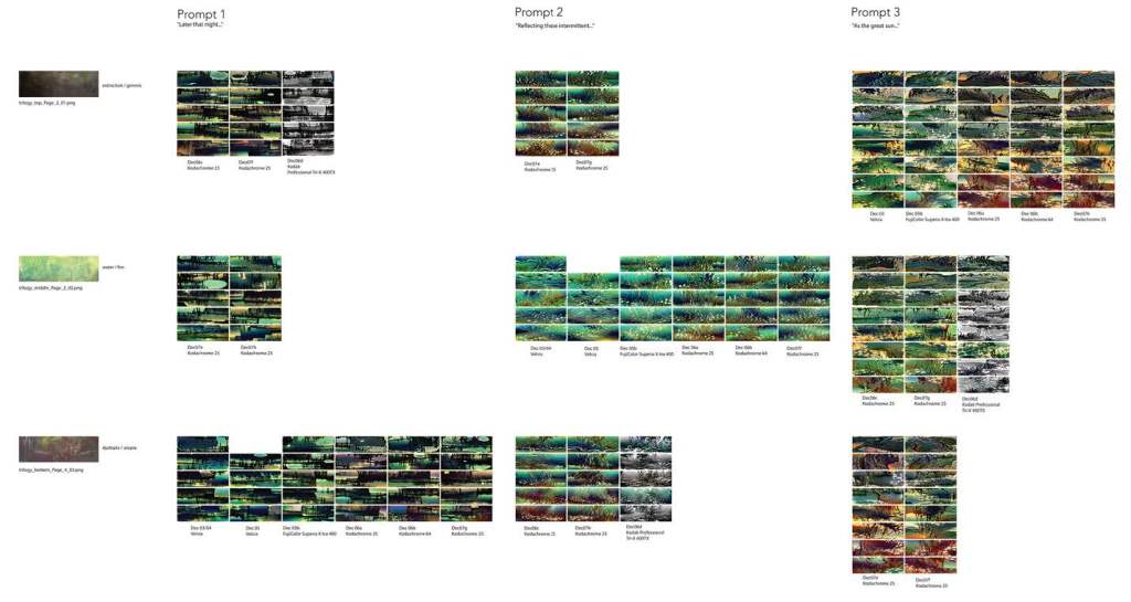 This image represents a mapping of AI mediated latent space in the text-image synthesis employed in The Drowned World project. I explore aesthetic affordance in such content matrices. Here, the semantic space of a dream described in J. G. Ballard’s novel is mapped onto autographic painting space. The grid represents a small selection of the exploratory sampling conducted; left-to-right are the 3 prompts from the novel and bottom-to-top major groupings are the resultant spaces generated by the three paintings on the left, a triptych hand-painted by the artist in response to themes in the novel.