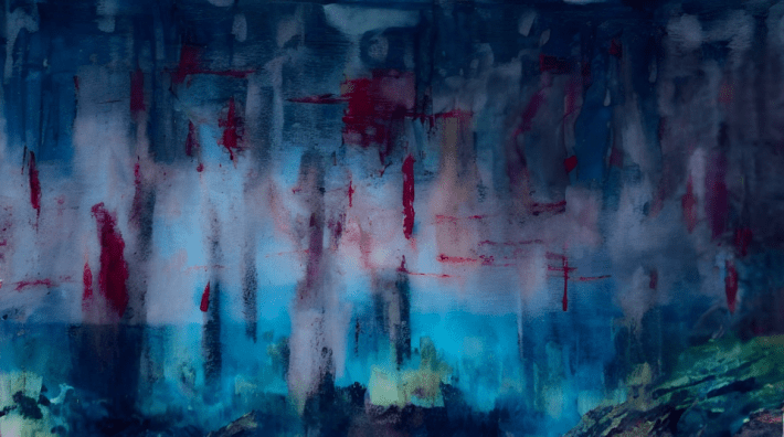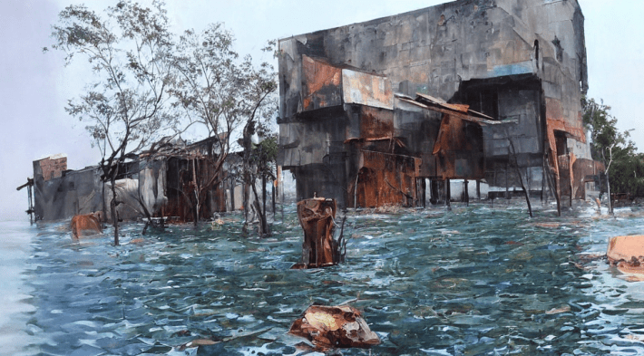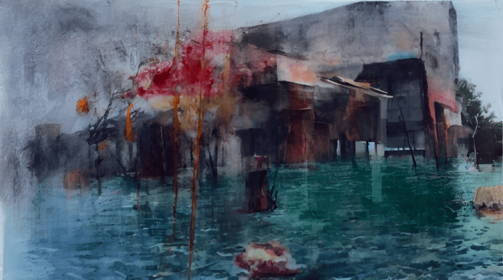 /// The animation investigates the phenomenology of discreet temporal parameter changes on aesthetic perception. Starting from oil-on-paper collages (also made from prints of AI mediated drawings), I build layers of generative AI imagery where one change affects another in often unpredictable ways in a kind of Open Work structure (Umberto Eco) that also acknowledges the chance operations of John Cage. The theme explores metaphors of a world drowning in the twin environments of climate change and information deluge. ///
